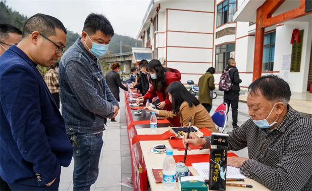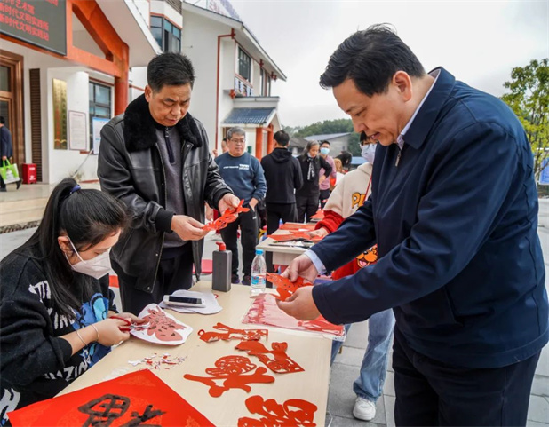 活动现场,市艺术馆文化志愿者郭舒、戴建明、吴裕灶、许旺、郑明华、郑希建、马三秀、郑莹、肖心怡、林可渲等十几位艺术家挥毫泼墨,带着清新墨香、凝结着吉祥寓意的“福”字和春联在他们笔端一挥而就。剪纸老师利用手中的剪刀剪出各个式好看的图案,为围观村民送去新春祝福。活动现场人头攒动,气氛热烈,现场群众迫不及待地请书法老师为他们书写春联,拿到春联的群众喜悦之情溢于言表。